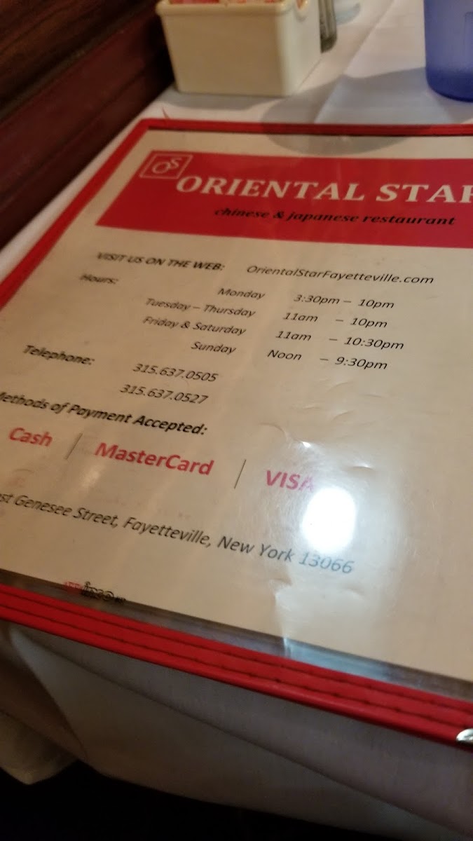 Looking for a spot that offers a delightful mix of flavors and a warm, inviting atmosphere? Look no further than the Oriental Star Menu. Located at 210 W Genesee St, Fayetteville, NY, this restaurant serves up a variety of Asian-inspired dishes perfect for any craving. From fresh sushi rolls to savory stir-fries, the menu is packed with bold and comforting options. Whether you're in the mood for a hearty bowl of noodles or some delicious dim sum, each dish is crafted with care and packed with flavor. The variety is vast, ensuring there's something for everyone, whether you're a fan of seafood, poultry, or vegetarian delights. With every bite, you'll experience the perfect balance of taste and quality, making Oriental Star Menu a go-to destination for food lovers in the area.